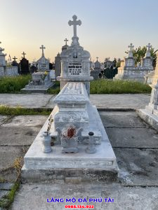 Mộ đá công giáo cấu tạo cũng như các mẫu lăng mộ đá khác. Tại Lăng Mộ Đá Phú Tài, mộ đá công giáo sẽ được chế tác bằng đá nguyên khối, gia chủ có thể lựa chọn lăng mộ đá theo mong muốn, 3 loại đá được sử dụng để xây dựng và chế tác lăng mộ đá đẹp là đá xanh rêu, đá xanh đen và đá trắng.